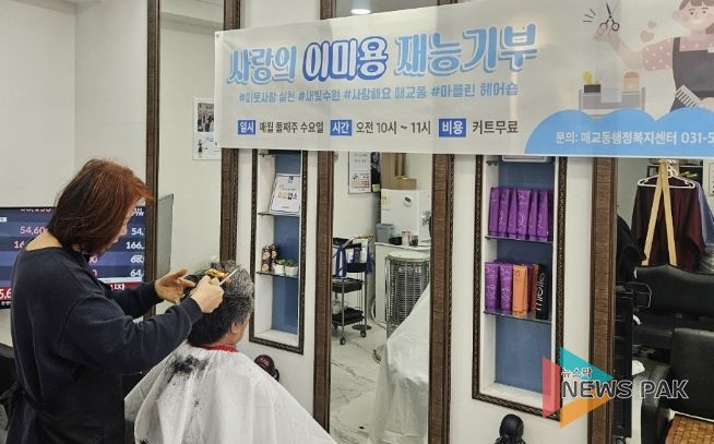 뉴스팍 배상미 기자 | 수원시 팔달구 매교동 행정복지센터는 지난 8일 매교동 소재 마를린 헤어숍과 함께 ‘사랑의 이미용 서비스’를 실시했다. 이날 머리 손질을 희망하는 관내 어려운 이웃 16명에게 커트 및 드라이 서비스를 제공하며 따뜻한 나눔의 시간을 가졌다.