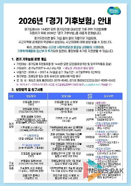 뉴스팍 배상미 기자 | 경기도가 진단비를 최대 두 배 인상하고, 사망위로금을 신설하는 등 보장 혜택을 대폭 강화한 ‘2026년 경기 기후보험’을 시작했다고 13일 밝혔다.
