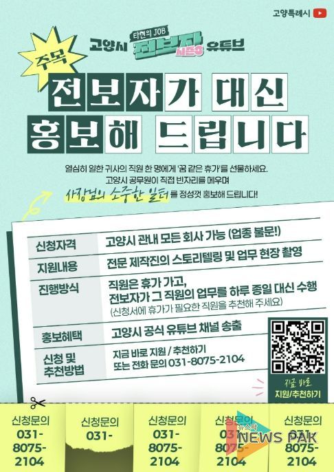 뉴스팍 배상미 기자 | 고양특례시가 공식 유튜브 채널의 직업 체험 콘텐츠 ‘전보자(타인의 Job)’ 시즌 3를 맞아, 시민 삶의 현장으로 직접 찾아가는 홍보 프로젝트에 참여할 기업과 일터를 모집한다고 14일 밝혔다.