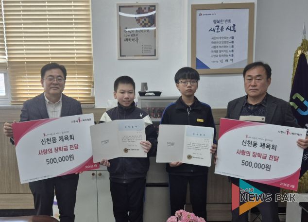 뉴스팍 배상미 기자 | 시흥시 신천동 체육회는 지난 4월 13일 신천동 행정복지센터에서 관내 신천중학교 학생 2명에게 장학금을 전달하며 따뜻한 이웃 사랑을 실천했다.