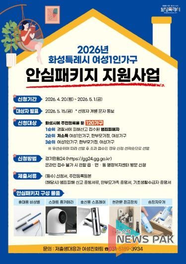 뉴스팍 류은정 기자 | 화성특례시는 범죄 대응에 취약한 여성 1인가구 등 사회적 약자의 안전한 생활을 지원하기 위해 ‘2026년 여성1인가구 안심패키지 지원사업’을 추진하고 대상자를 모집한다고 밝혔다.