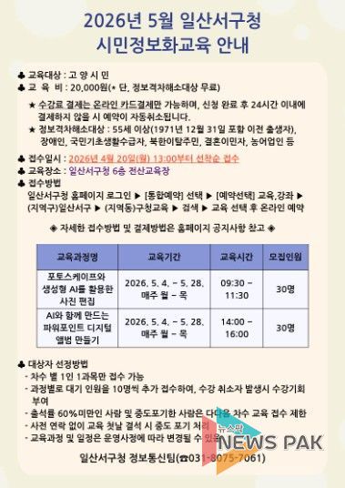 교육은 5월 4일부터 5월 28일까지 매주 월요일부터 목요일까지 진행되며, 과정별 30명을 모집한다. 교육 장소는 일산서구청 6층 전산교육장이다.