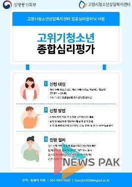 뉴스팍 배상미 기자 | 고양시청소년재단 청소년상담복지센터는 2026년 신규사업 ‘고위기청소년종합심리평가’를 운영한다고 16일 밝혔다.