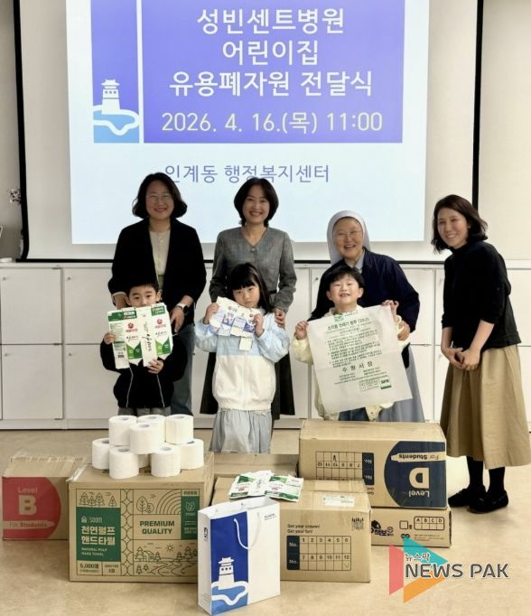 뉴스팍 배상미 기자 | 수원시 팔달구 인계동은 지난 16일 오전, 성빈센트병원 어린이집으로부터 아이들이 정성껏 모은 유용 생활 폐자원을 전달받았다고 밝혔다.