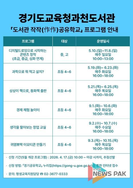 뉴스팍 배상미 기자 | 경기도교육청과천도서관이 학생들의 자기주도 학습 역량과 창의적 사고력 함양을 위해 ‘도서관 작작(作作) 공유학교’를 운영한다.