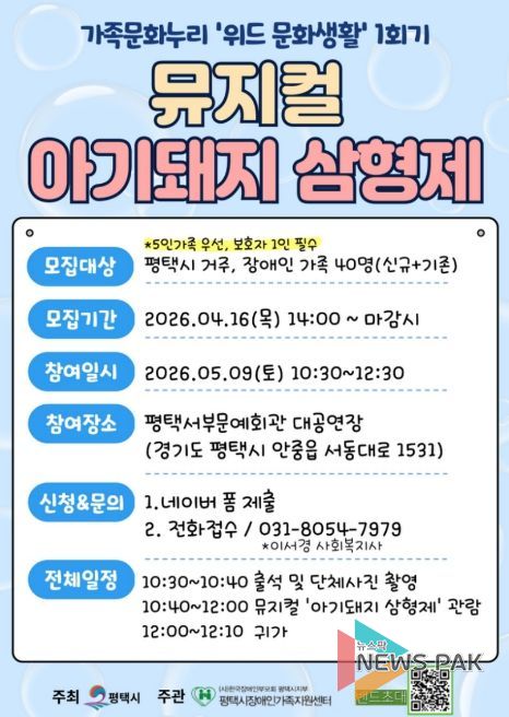 이번 1회기는 오는 5월 9일 오전 10시 30분부터 12시까지 평택서부문예회관에서 진행되며, 가족뮤지컬 ‘아기돼지 삼형제’관람 프로그램으로 운영된다. 공연 관람을 통해 가족 간 상호작용을 촉진하고 긍정적인 정서 경험을 통한 유대감 향상에 기여할 수 있을 것으로 기대된다.