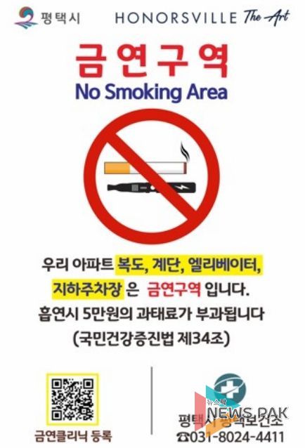 뉴스팍 이소율 기자 | 평택시가 시민의 건강권을 보호하고 담배 연기 없는 쾌적한 주거환경을 조성하기 위해 지난 3월 10일, 통복동 소재 ‘평택역 경남아너스빌 디아트’를 평택시 제45호 공동주택 금연구역(금연아파트)으로 지정했다고 밝혔다.