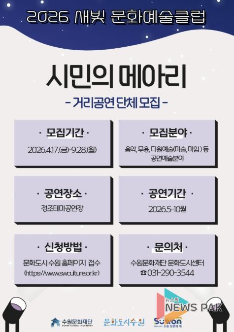 뉴스팍 배상미 기자 | 수원문화재단은 지역 공연예술의 활성화와 수원시민의 주체적 문화예술 참여를 위해 ‘새빛 문화예술클럽 '시민의 메아리'’ 사업에 참여할 생활예술단체를 모집한다.