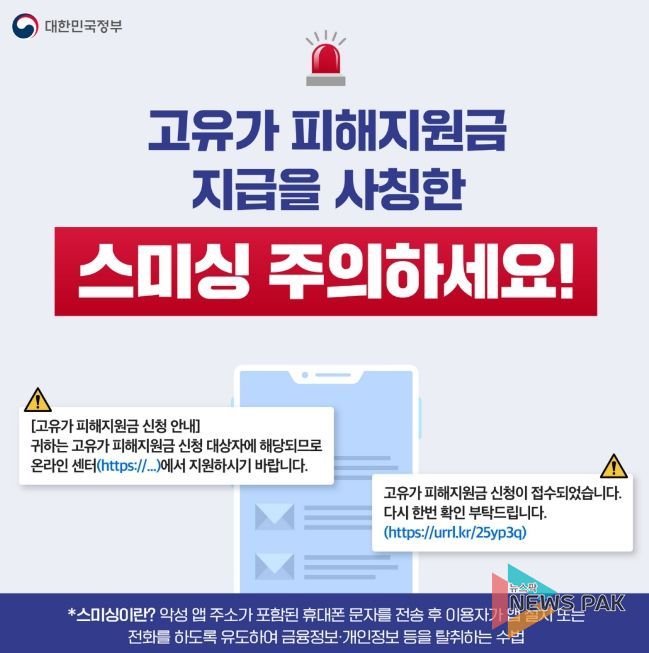 뉴스팍 배상미 기자 | 안성시가 오는 27일부터 신청하는 ‘고유가 피해지원금’ 신청을 앞두고 정부 및 지자체 등을 사칭한 스미싱 등 금융 사기에 대해 시민들의 각별한 유의를 당부했다. 시는 특히 공식 알림 서비스인 ‘국민비서’를 적극 활용해 사기 피해를 예방할 것을 권고했다.