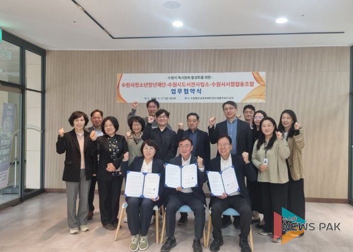 뉴스팍 배상미 기자 | 수원시 도서관사업소와 수원시청소년청년재단, 수원시서점협동조합이 지역 독서문화 활성화와 시민 독서활동 증진을 위해 협력하기로 했다.
