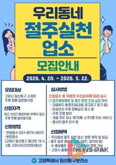 뉴스팍 배상미 기자 | 고양특례시 일산동구보건소는 지역사회 내 음주로 인한 각종 폐해를 예방하고 건전한 음주문화를 확산하기 위해 ‘우리동네 절주실천업소’를 오는 20일부터 모집한다.