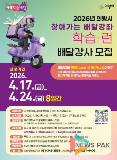 뉴스팍 배상미 기자 | 의왕시가 시민이 원하는 시간과 장소에 강사를 파견하는 맞춤형 평생학습 서비스인‘2026년 찾아가는 배달 강좌 학습-런(Run)’사업에 활동할 역량 있는 시민을 모집한다.