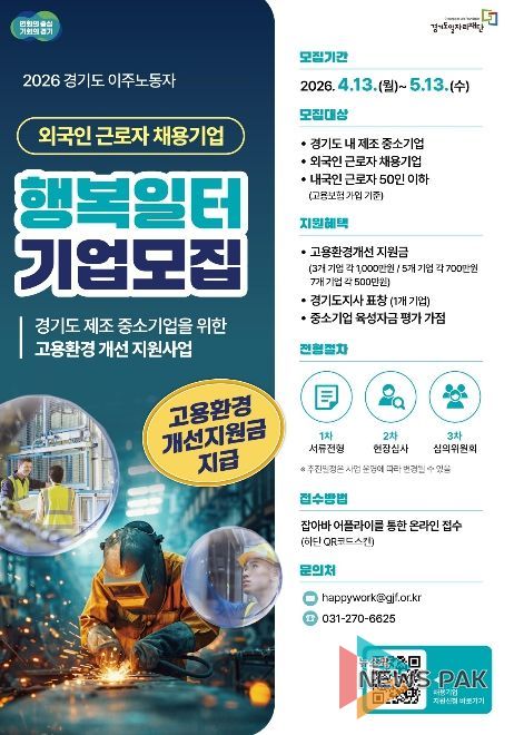 뉴스팍 배상미 기자 | 경기도와 경기도일자리재단은 도내 외국인 근로자를 고용한 중소 제조기업을 대상으로 ‘2026년 경기도 이주노동자 행복일터 선정사업’ 참여기업을 모집한다고 20일 밝혔다.