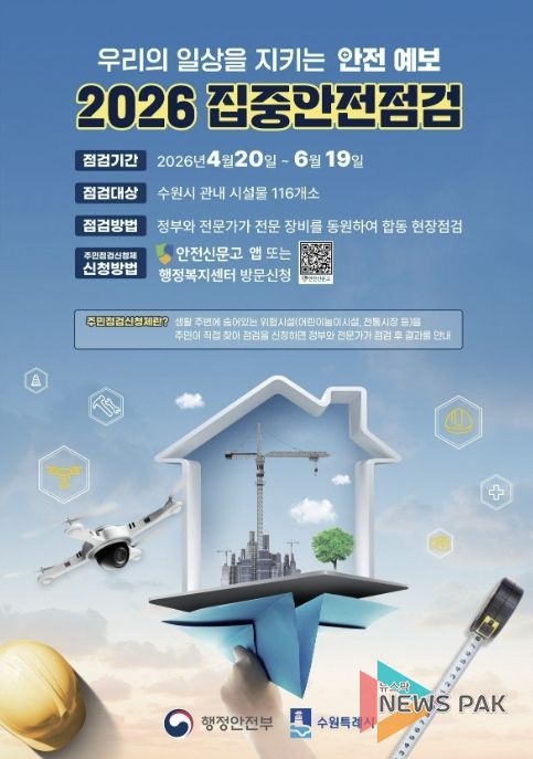 뉴스팍 배상미 기자 | 수원특례시가 안전사고를 예방하고, 시민의 안전 의식을 고취하기 위해 20일부터 6월 19일까지 ‘2026년 집중안전점검’을 한다.
