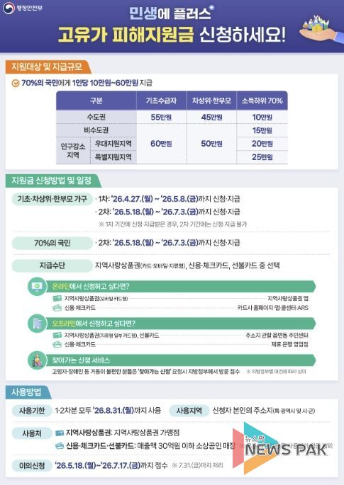 고유가 피해지원금은 지급기준일인 2026년 3월 30일 기준 국내 거주 국민의 70%를 대상으로 지급되며, 군포시는 수도권 기준이 적용된다. 이에 따라 기초생활수급자는 1인당 55만 원, 차상위계층 및 한부모가족은 45만 원, 소득 하위 70%는 10만 원을 지원받게 된다.