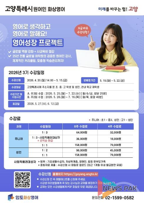 뉴스팍 배상미 기자 | 고양특례시는 글로벌 역량 강화와 사교육비 부담 완화를 위한 ‘원어민 화상영어’ 프로그램의 3기 수강생을 4월 20일부터 5월 15일까지 모집한다.