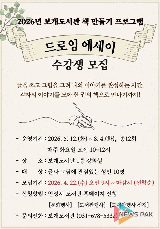 뉴스팍 배상미 기자 | 안성시 보개도서관(책문화센터)이 시민들의 창작 활동을 지원하고 일상 속 예술 경험을 확대하기 위해 오는 5월부터 ‘드로잉 에세이’와 ‘포토 에세이’ 책 만들기 프로그램을 새롭게 운영한다고 밝혔다.