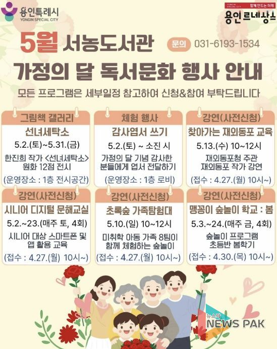 뉴스팍 배상미 기자 | 용인특례시 서농도서관은 오는 5월 가정의 달을 맞아 다양한 세대를 아우르는 프로그램으로 이뤄진 ‘2026년 5월 독서문화행사’를 마련했다고 21일 밝혔다.