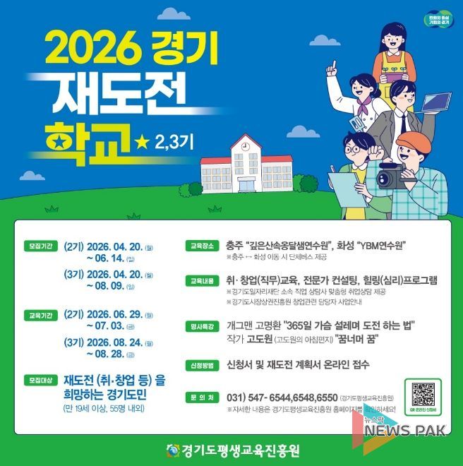 뉴스팍 배상미 기자 | 경기도와 경기도평생교육진흥원은 취업이나 창업 실패를 경험한 도민의 재기를 지원하기 위해 오는 20일부터 ‘2026년 경기 재도전학교’ 2~3기 참가자를 각각 55명 내외로 모집한다.