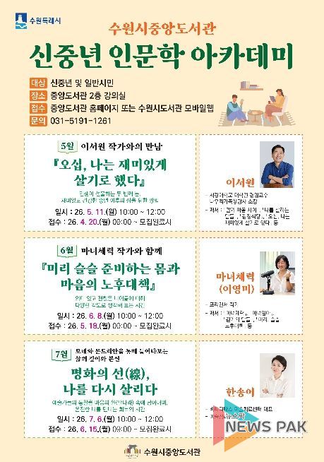 뉴스팍 배상미 기자 | 수원시 중앙도서관이 5월부터 7월까지 매달 1회 운영하는 ‘신중년 인문학 아카데미’ 수강생을 모집한다.
