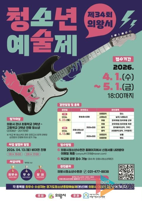 뉴스팍 배상미 기자 | 의왕시청소년재단 산하 의왕시청소년수련관은 지역 청소년의 예술적 재능과 끼 발산의 장인 ‘제34회 의왕시청소년예술제’의 참가자를 5월 1일까지 모집한다고 밝혔다.