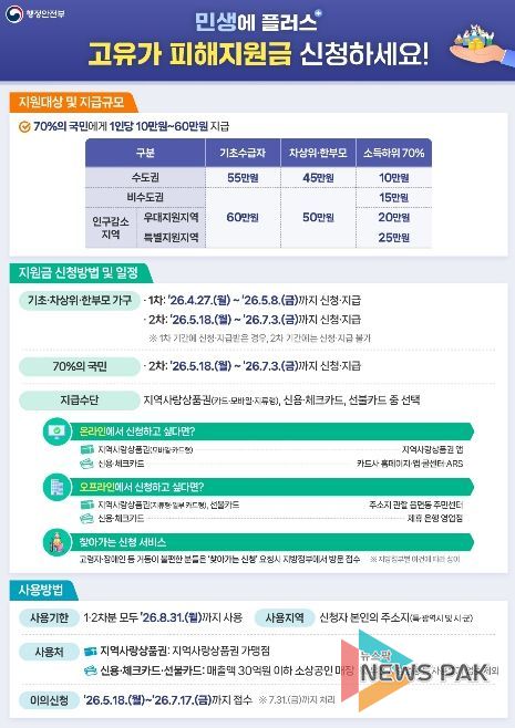 뉴스팍 이소율 기자 | 평택시는 중동 전쟁 여파로 인한 시민들의 경제적 부담을 덜어주기 위한 ‘고유가 피해지원금’지급 계획을 확정하고 본격적인 시행에 나선다고 밝혔다.