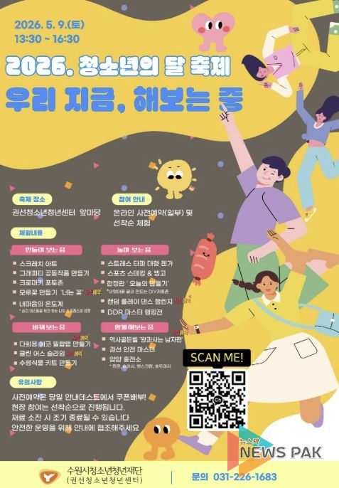 뉴스팍 배상미 기자 | 수원시청소년청년재단 권선청소년청년센터가 오는 5월 9일, 청소년이 주인공이 되어 직접 경험하고 도전하는 참여형 축제 ‘지금우리, 해보는중’을 개최한다고 밝혔다.