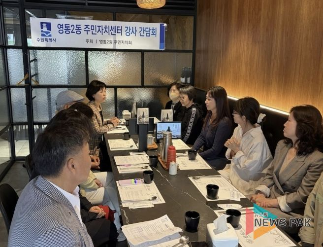 뉴스팍 배상미 기자 | 수원시 영통구 영통2동은 지난 22일 영통2동 주민자치회가 주민자치센터 프로그램 운영과 관련한 다양한 의견을 수렴하고, 보다 내실 있는 운영과 활성화 방안을 모색하기 위해 주민자치센터 프로그램 강사진과의 간담회를 개최했다고 밝혔다.