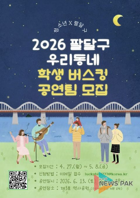 뉴스팍 배상미 기자 | 수원시 팔달구가 청소년들이 직접 주인공이 되어 공연에 참여하고 즐기는 ‘2026 팔달구 우리동네 학생 버스킹’의 공연팀을 모집한다고 밝혔다.