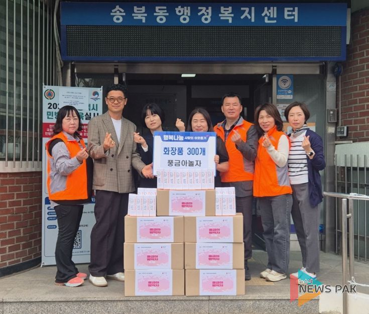 뉴스팍 이소율 기자 | 풍금아놀자는 지난 22일 화장품 300개를 평택시 송북동 행정복지센터에 전달했으며, 기부된 화장품은 송북동 내 취약계층 가구에 전달될 예정이다.