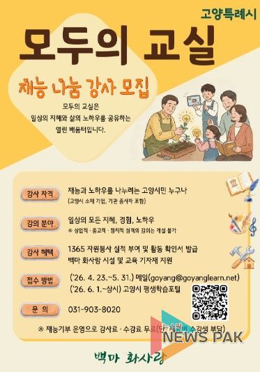 뉴스팍 배상미 기자 | 고양특례시가 올해 시민의 재능을 지역의 배움으로 연결하는 백마 화사랑 ‘모두의 교실’을 운영하며, 재능을 기부할 시민 강사를 상시 모집한다고 23일 밝혔다.