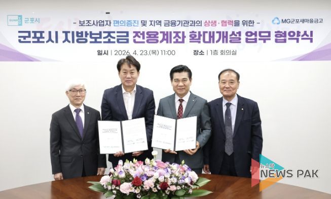 뉴스팍 배상미 기자 | 군포시는 지방보조금 전용계좌 개설 금융기관을 기존 시 금고인 NH농협은행에 더해 새마을금고까지 확대하기 위한 업무협약을 23일 체결했다고 밝혔다.