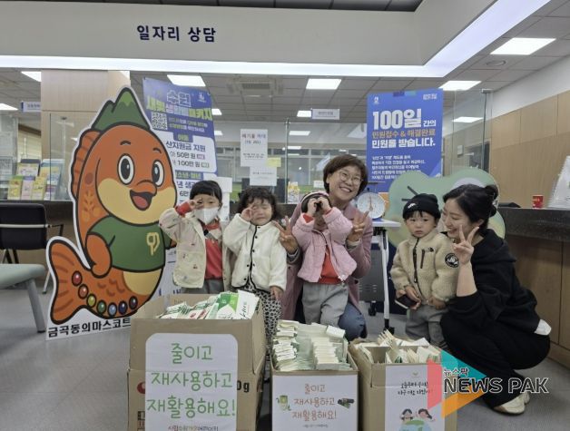 뉴스팍 배상미 기자 | 수원시 권선구 금곡동 행정복지센터는 지난 22일 오전 10시, 행정복지센터 민원실에서 시립수원가온어린이집 원생 10여 명이 참여한 ‘금곡이가 알려주는 재활용 놀이터’ 체험 행사를 진행했다고 밝혔다.