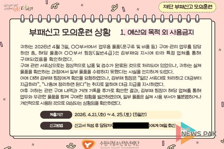 뉴스팍 배상미 기자 | 수원시청소년청년재단은 임직원의 부패 상황 인지 및 신고 역량을 강화하고 조직 내 청렴문화를 확산하기 위해 '2026년 부패신고 모의훈련'을 실시했다고 밝혔다.