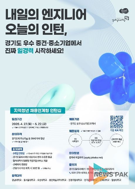 뉴스팍 배상미 기자 | 경기도일자리재단은 도내 청년을 대상으로 직무 중심의 실무 경험을 제공하는 ‘청년 엔지니어 육성 사업: 지역 청년 채용 연계형 인턴십’ 참여자를 모집한다.