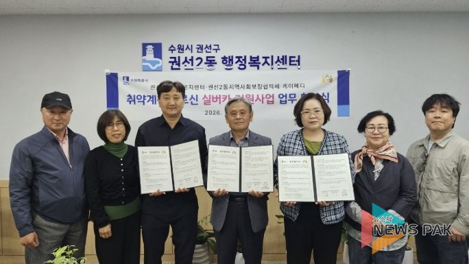 뉴스팍 배상미 기자 | 수원시 권선구 권선2동은 지난 23일, 권선2동 지역사회보장협의체, 케이메디와 취약계층 어르신의 안전한 이동 지원과 삶의 질 향상을 위한 “실버카(보행보조기) 지원사업 업무협약(MOU)”을 체결했다.