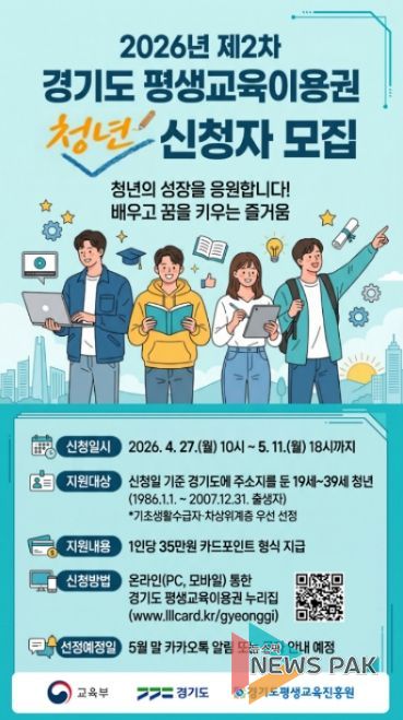 뉴스팍 이소율 기자 | 평택시는 경제적 여건에 따른 교육 격차를 완화하고 청년들의 자기계발을 지원하기 위해 녪년 제2차 경기도 평생교육 이용권’신청 접수를 27일부터 시작한다고 밝혔다.