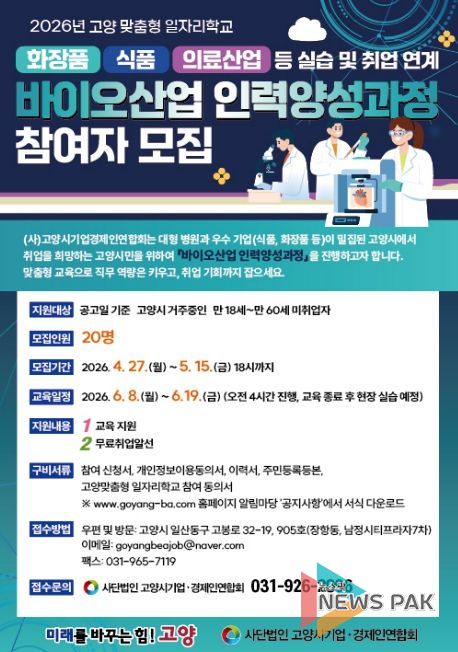뉴스팍 배상미 기자 | 고양특례시는 2026년 고양맞춤형 일자리학교 공모사업 중 ‘바이오산업 인력 양성과정’의 참여자를 모집한다.