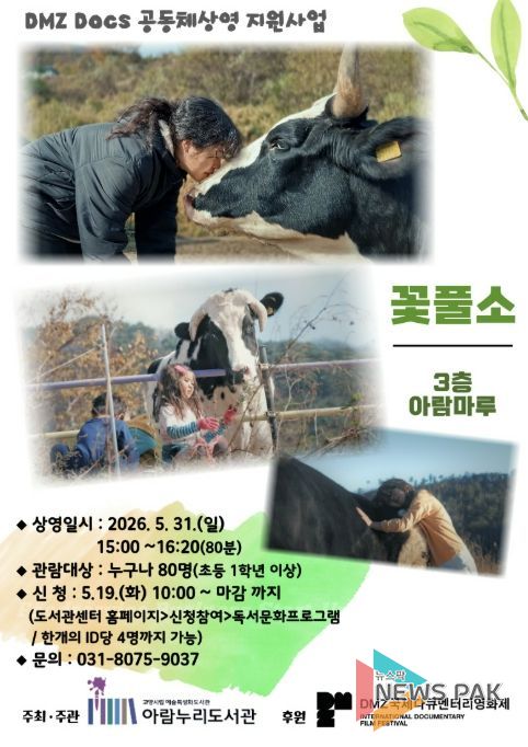 뉴스팍 배상미 기자 | 고양특례시 아람누리도서관은 DMZ국제다큐멘터리영화제와 협업해 오는 5월 31일 오후 3시, 도서관 3층 아람마루에서 다큐멘터리 영화 ‘꽃풀소’ 상영회를 개최한다.