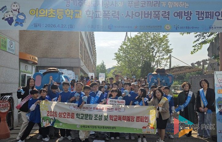 이번 캠페인은 최근 급증하는 청소년 사이버폭력 사안에 대응하고 건강한 디지털 시민 의식을 함양하기 위해 마련됐으며, 수원교육지원청을 비롯해 경기주택도시공사(GH), 푸른나무재단(푸른코끼리), 이의초 학부모회 관계자 등이 참여했다.