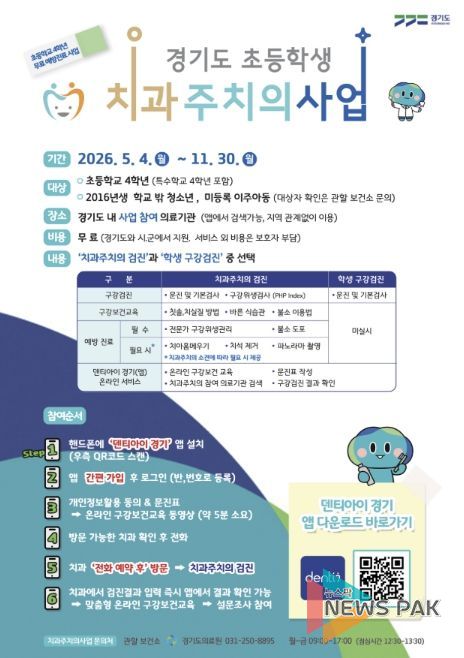 뉴스팍 배상미 기자 | 용인특례시는 5월 4일부터 11월 30일까지 지역 내 초등학교 4학년(2016년생) 학생 대상으로 ‘초등학생 치과주치의 사업’을 운영한다고 28일 밝혔다.