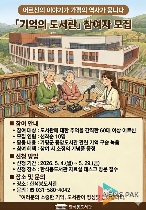 뉴스팍 배상미 기자 | 가평군 한석봉도서관이 오는 5월부터 어르신들의 생생한 목소리로 지역의 옛 기록을 수집하는 ‘기억의 도서관’ 프로그램을 운영한다. 실버층 특화 사업인 ‘말랑말랑 추억 교실’의 일환으로 추진되는 이번 사업은 지역 문화 자산을 확보하고 세대 간 기억을 공유하고자 기획됐다.