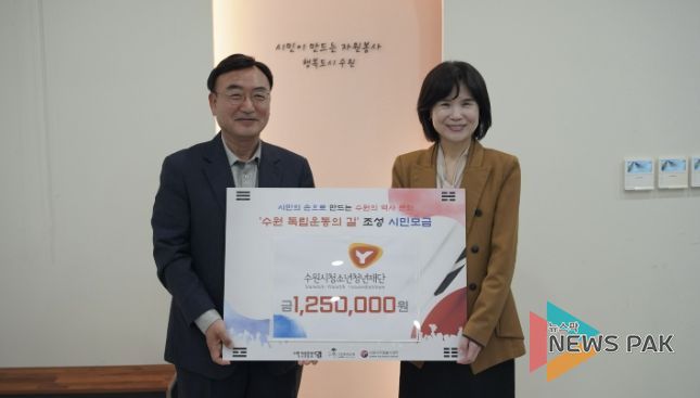 뉴스팍 배상미 기자 | 수원시청소년청년재단은 28일, 수원시자원봉사센터와 수원 독립운동의 길 추진위원회가 주관하는 ‘수원 독립운동의 길’ 조성 시민 모금에 재단 임직원이 자율적으로 모금한 125만원을 기부했다고 밝혔다.