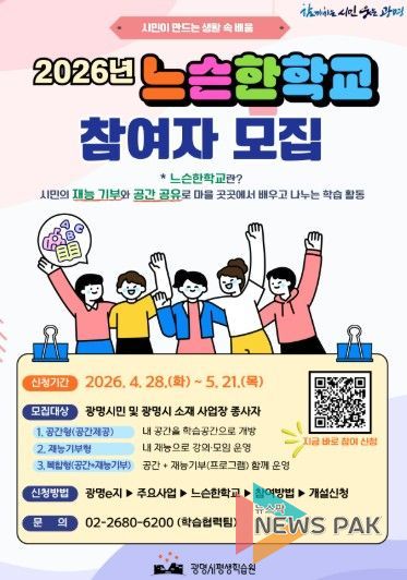 뉴스팍 배상미 기자 | 광명시가 시민이 직접 가르치고 배우는 시민참여형 평생학습 프로그램 ‘느슨한학교’ 신규 운영자를 오는 5월 21일까지 모집한다.