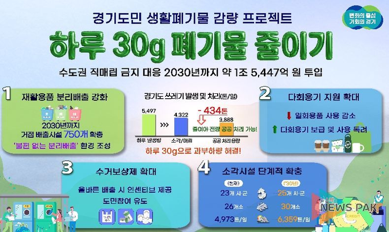 뉴스팍 배상미 기자 | 수도권 직매립 금지에 따른 생활쓰레기 감량을 위해 경기도가 2030년까지 5년간 약 1조 5,447억 원을 투입하는 ‘하루 30g, 도민실천형 생활폐기물 감량 프로젝트’를 추진한다.