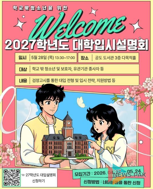뉴스팍 배상미 기자 | 안성시학교밖청소년지원센터는 학교 밖 청소년의 성공적인 진학을 돕기 위해 오는 5월 28일 오후 1시 30분부터 공도 도서관 다목적홀에서 ‘2027학년도 대학 입시 설명회’를 개최한다고 밝혔다.
