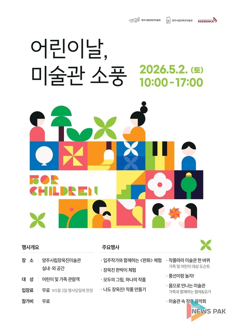 뉴스팍 배상미 기자 | 양주시는 오는 5월 2일 양주시립장욱진미술관 실내외 공간에서 어린이날 맞이 가족 문화행사 ‘어린이날, 미술관 소풍’을 개최한다.