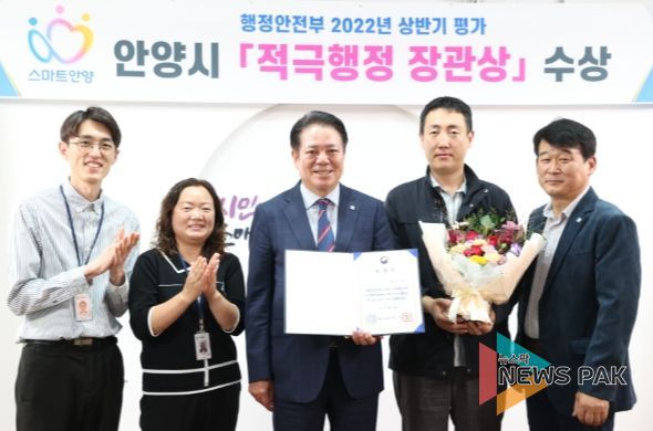 뉴스팍 최지은 기자 | 시민을 최우선으로 시민 불편 해소에 앞장서 온 안양시가 행정안전부 주관 2022년 상반기 적극행정 우수기관으로 선정됐다.