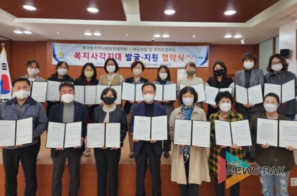 뉴스팍 최지은 기자 | 부곡동 지역사회보장협의체와 어린이집 및 아파트관리소 20개소는 지난 27일 부곡동주민센터에 모여 복지 사각지대 발굴과 지원을 위한 협약식을 진행했다.