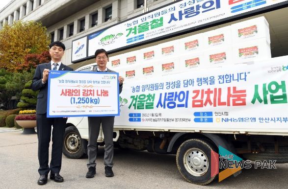 뉴스팍 최지은 기자 | 안산시는 3일 NH농협 안산시지부로부터 관내 저소득층 이웃을 위한 김장김치 10kg 125박스(625만 원 상당)을 기탁받았다.